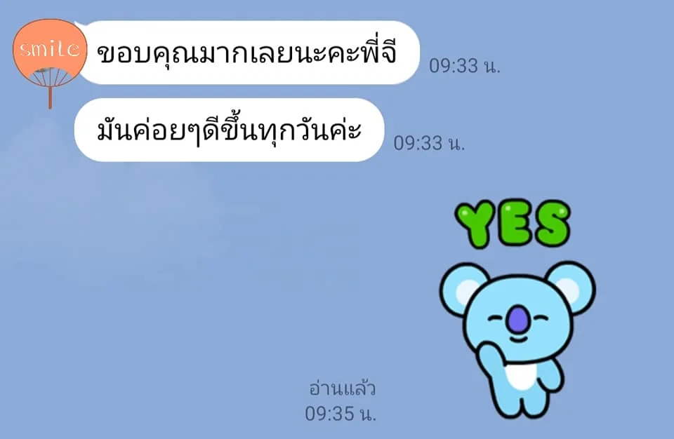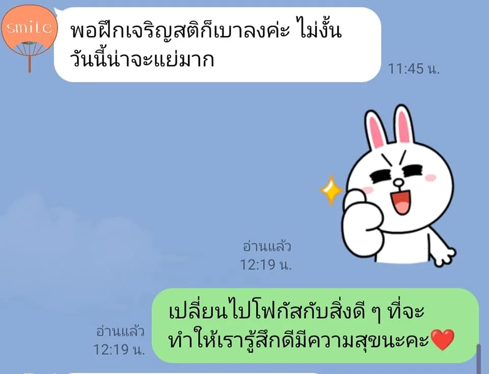 แต่ในที่สุดน้องก็สามารถวางใจตัวเองได้ดีขึ้นมาก และฝึกเจริญสติอย่างต่อเนื่องจนสามารถพัฒนาความฉลาดทางอารมณ์หรือเพิ่มระดับ EQ จากเดิมที่เคยอยู่ในระดับต่ำกว่าปกติมากได้สำเร็จ จริง ๆ แล้วน้องเป็นคนเก่งมากมีศักยภาพยอดเยี่ยมมากมาย แต่ถูกบดบังด้วยความกลัว ความกังวล และปล่อยให้มันขับเคลื่อนชีวิตและจิตใจมายาวนานจนเกิดความเจ็บป่วย ซึ่งการได้เรียนรู้และพัฒนาตัวเองนี้จะช่วยให้น้องสามารถก้าวข้ามผ่านช่วงเวลาที่ยากลำบากในชีวิตช่วงหนึ่งไปได้ สามารถลดการใช้ยาลงได้ และจีเชื่อมั่นว่าน้องจะสามารถหยุดยาได้ในอนาคตอันใกล้ รวมทั้งเมื่อหายป่วยแล้วน้องสามารถป้องกันการกลับมาป่วยซ้ำได้ด้วย หากน้องดูแลสมดุลชีวิตและจิตใจของตัวเองได้อย่างต่อเนื่อง