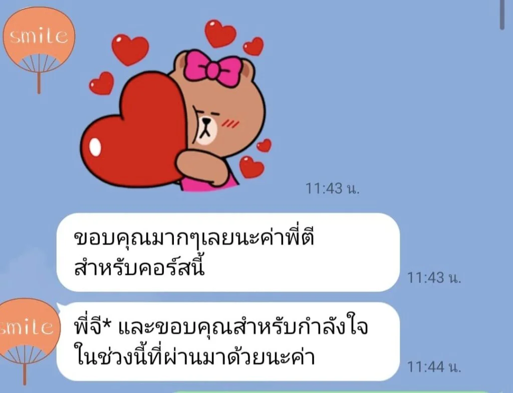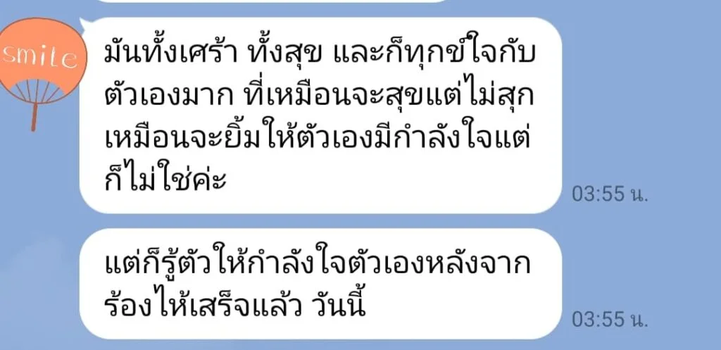 ขอบคุณน้องเมย์ (นามสมมติ) ที่อนุญาตให้แชร์ประสบการณ์ของตัวเอง เพื่อเป็นประโยชน์และเป็นแรงบันดาลใจเพื่อผู้อื่นต่อไป และขอบคุณสำหรับกำลังใจ รวมทั้งความเป็นกัลยาณมิตรที่ดีงามที่มีให้กันเสมอมา ขอให้น้องมีความสุขและประสบความสำเร็จในชีวิตดั่งที่ใจปรารถนา และขอเป็นกำลังใจให้เพื่อนผู้ป่วยโรคซึมเศร้าและโรคทางจิตเวชอื่น ๆ ก้าวข้ามผ่านมันไปได้เช่นกันค่ะ
