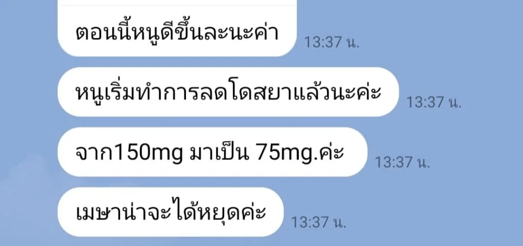 หลังจากที่น้องเมย์ได้ตัดสินใจอนุญาตให้จีได้เข้าไปช่วยดูแลส่วนตัว และเรียนรู้การเยียวยาพัฒนาตนเองใน คอร์สเยียวยารักษาใจและพัฒนาคุณภาพชีวิต จีได้เริ่มต้นแพลนแนวทางที่จะช่วยในการเยียวยารักษาใจ และพัฒนาคุณภาพชีวิตของน้องเมย์ให้เป็นไปในทิศทางที่ดีขึ้น เราโทรไลน์พูดคุยและเยียวยาบำบัดจิตใต้สำนึกกันทุกสัปดาห์ รวมทั้งแชทพูดคุยทางไลน์ส่วนตัวอย่างต่อเนื่อง แนวทางการเยียวยารักษาใจและพัฒนาคุณภาพชีวิต ในคอร์สดูแลส่วนตัวต่อเนื่อง 3 เดือนที่จีออกแบบไว้ จะเป็นกระบวนการในการเยียวยาบำบัดแบบพูดคุย และการเยียวยาบำบัดจิตใต้สำนึก รวมทั้งมี Workshop ให้ลงมือทำอย่างต่อเนื่อง ในการช่วยสร้างความเปลี่ยนแปลงและพัฒนาตัวเองของน้อง ไม่ว่าจะเป็นเรื่องของการเพิ่ม self-esteem เพื่อมองเห็นคุณค่าในตนเอง รักและเมตตาตัวเองให้เป็น และมั่นใจในตัวเองที่จะกลับไปใช้ชีวิตตามปกติได้ดีขึ้น รวมทั้งปรับมุมมองทางความคิด (Mindset) ปรับบุคลิกภาพและวิถีชีวิตให้สมดุล เพื่อช่วยให้น้องลดการใช้ยาลง และสามารถที่จะหยดุยาได้ตามเป้าหมาย อีกทั้งยังเป็นแนวทางที่สามารถป้องกันการกลับมาป่วยเป็นโรคซึมเศร้าซ้ำในอนาคตอีกด้วย