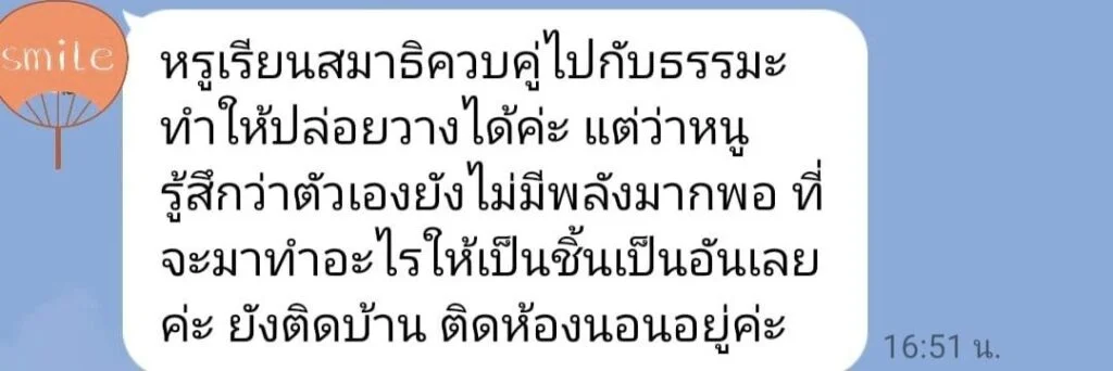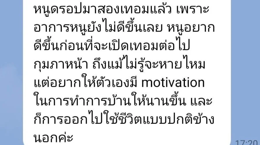 น้องเมย์ (นามสมมติ) ป่วยเป็นโรคซึมเศร้าและกินยารักษามาประมาณปีกว่า น้องทักมาทาง เพจเยียวยารักษาใจ : Heal your mind by GG หลังจากที่สั่งซื้อ ทางออนไลน์ผ่านทางเว็บไซต์ Meb Market เพราะสนใจแนวทางการเยียวยาบำบัดโรคซึมเศร้าในแบบของจี โดยเฉพาะการเยียวยาบำบัดจิตใต้สำนึกออนไลน์ น้องเมย์อาศัยอยู่ที่ประเทศออสเตรเลีย น้องบอกว่ารักษาด้วยยาจนเริ่มมีอาการทรงตัวมากขึ้นแล้ว คุณหมอบอกว่าถ้าอาการทรงตัวแบบนี้ไปเรื่อย ๆ อีกประมาณ 6-8 เดือนก็จะสามารถหยุดยาได้ น้องจึงมองหาการเยียวยาบำบัดและพัฒนาตนเอง ซึ่งตอนนั้นน้องฝึกสมาธิ ฝึกสติ ใช้ธรรมะในการเยียวยาประคับประคองกายใจตัวเอง หลังจากที่ได้พูดคุยกันน้องตัดสินใจเลือก เพื่อเรียนรู้การดูแลเยียวยาและพัฒนาตัวเองไปด้วยกันกับจีต่อเนื่องสามเดือน