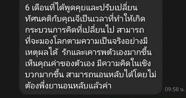 หากต้องการพูดคุยกับจีหรือสอบถามข้อมูลเพิ่มเติมเกี่ยวกับการเยียวยาบำบัดโรคซึมเศร้าทางเลือก สามารถแอดไลน์เพิ่มเพื่อนได้เลยค่ะ