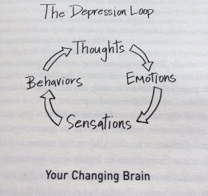 จากภาพแสดงให้เห็น ลูปของโรคซึมเศร้า (The Depression Loop) และการทำงานของสมองที่เปลี่ยนแปลงไป ถ้าหาก ความคิด (Thoughts) ที่เกิดขึ้นเป็นด้านลบ มันก็จะส่งผลต่ออารมณ์(Emotions)ความรู้สึก (Sensation) และพฤติกรรม(Behaviors) ที่เป็นลบเช่นกัน แล้วมันก็จะวนไปที่ความคิดลบอีก ผู้ป่วยโรคซึมเศร้าจะไม่สามารถรับมือกับความคิดลบที่เกิดขึ้นได้เหมือนคนปกติทั่วไป เพราะอาการป่วยแต่มักไม่ค่อยรู้ตัวหรือตระหนักรู้ได้ในตอนนั้น