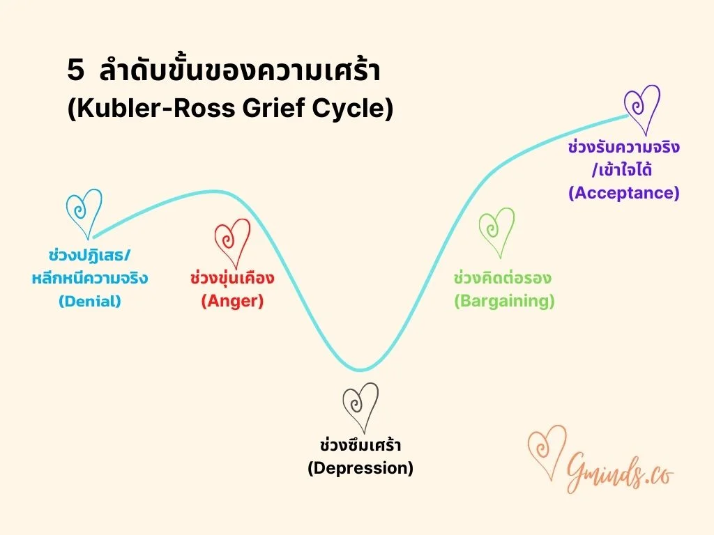 ซึ่งทางจิตวิทยาได้อธิบายถึง 5 ลำดับขั้นความโศกเศร้าไว้ (ตามรูปด้านบน) ถ้าเป็นคนปกติที่ไม่ได้ป่วยเป็นโรคซึมเศร้าหรือโรคทางจิตเวช ก็จะสามารถพาตัวเองก้าวออกจากวงจรความเศร้าได้เอง ซึ่งแต่ละคนจะใช้ระยะเวลาในการก้าวข้ามผ่านวงจรความเศร้านี้ก็จะแตกต่างกันไป ขึ้นอยู่กับสาเหตุปัจจัยและสภาพจิตใจของคน ๆ นั้น แต่ถ้าหากไม่สามารถก้าวข้ามผ่านได้ก็อาจส่งผลให้เกิดภาวะซึมเศร้าหรือโรคซึมเศร้าได้ ซึ่งเมื่อจิตใจเจ็บป่วยแล้วก็จะวนลูปอยู่ในวงจรความเศร้าซ้ำ ๆ และยาวนานขึ้น เรียกว่า ลูปของโรคซึมเศร้า (Depression Loop) และเราจะสามารถพาตัวเองออกจากวงจรความเศร้าหรือลูปของโรคซึมเศร้าได้ก็ต่อเมื่อใจเรายอมรับความจริงได้