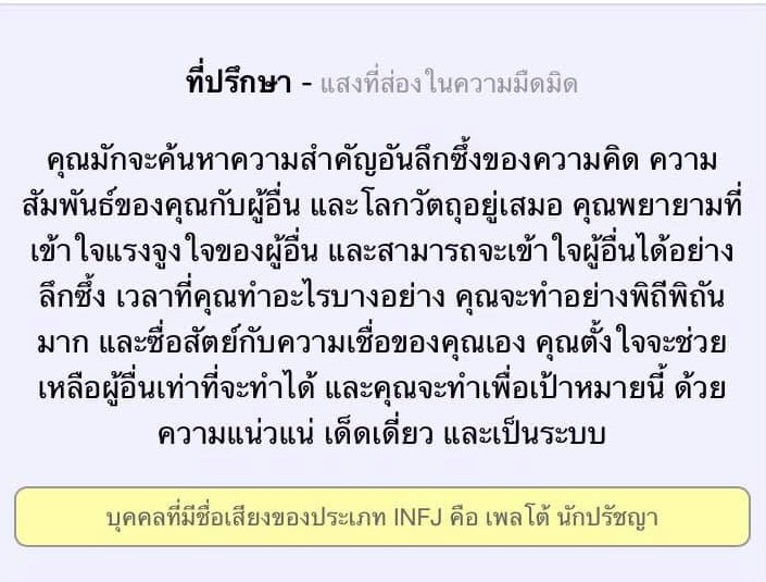 สวัสดีค่ะชาว INFJ และผู้ที่สนใจต้องการทำความเข้าใจกับบุคลิกภาพแบบ INFJ จีเองก็มีบุคลิกภาพนี้และสนใจศึกษาค้นคว้าเรื่องการพัฒนาบุคลิกภาพอย่างจริงจังก็ในช่วงที่กลับมาป่วยเป็นโรคซึมเศร้าอีกครั้ง เนื่องจากพบว่าตัวเองมีปัญหาเรื่องบุคลิกภาพเข้ามาเกี่ยวข้อง ซึ่งเป็นปัจจัยหรือสาเหตุร่วมที่สำคัญส่งผลให้ป่วยเป็นโรคซึมเศร้าอีกครั้ง มีอาการรุนแรงและซับซ้อนจนทำร้ายตัวเองต่อเนื่อง รวมทั้งเกือบจะฆ่าตัวตายอีกครั้งเช่นกัน จากการที่ได้ทำแบบทดสอบบุคลิกภาพและได้รู้จักกับเพื่อน ๆ ที่มีบุคลิกภาพแบบ INFJ อีกมากมายที่ไม่ค่อยเข้าใจตัวเองไม่มีความสุขกับการใช้ชีวิต รู้สึกแปลกแยกและสับสนในตัวเอง เพราะไม่เคยได้ทำความเข้าใจกับบุคลิกภาพของตัวเองให้มากพอ จีจึงอยากชวนเพื่อน ๆ มาทำความเข้าใจจะได้มีความสุขในแบบของตัวเองไปด้วยกันค่ะ หากใครยังไม่เคยทำแบบทดสอบหรือไม่รู้ว่าตัวเองมีบุคลิกภาพแบบไหนลองคลิกทำแบบทดสอบกันก่อนนะคะ แบบทดสอบบุคลิกภาพ MBTI (Myers-Briggs Type Indicator