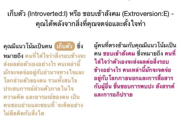 I = Introversion (การได้อยู่คนเดียวจะเป็นการชาร์จพลังชีวิตที่ดี)