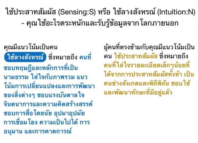 N = Intuition (รับรู้ข้อมูลโดยใช้สัญชาตญาณเป็นหลัก)