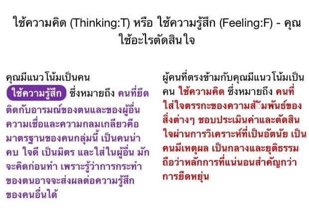 F = Feeling (วิธีที่ใช้ในการตัดสินใจใช้ความรู้สึกส่วนตัว)